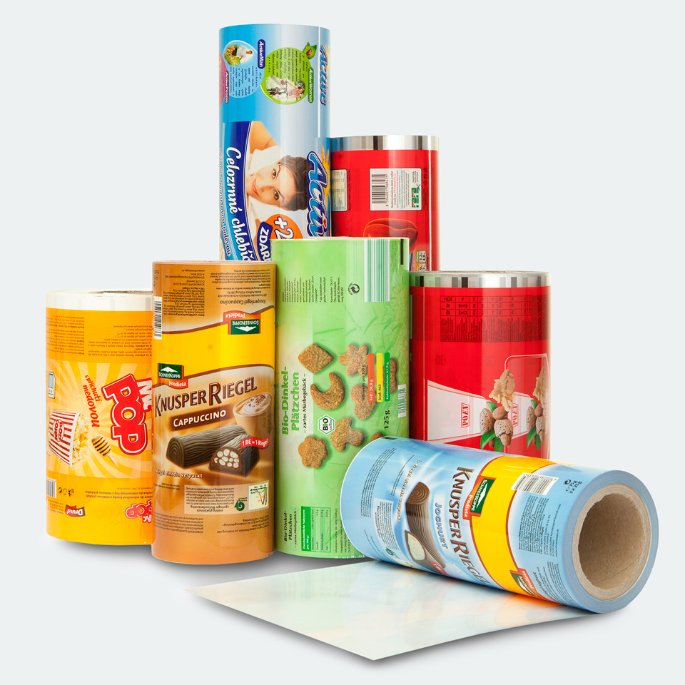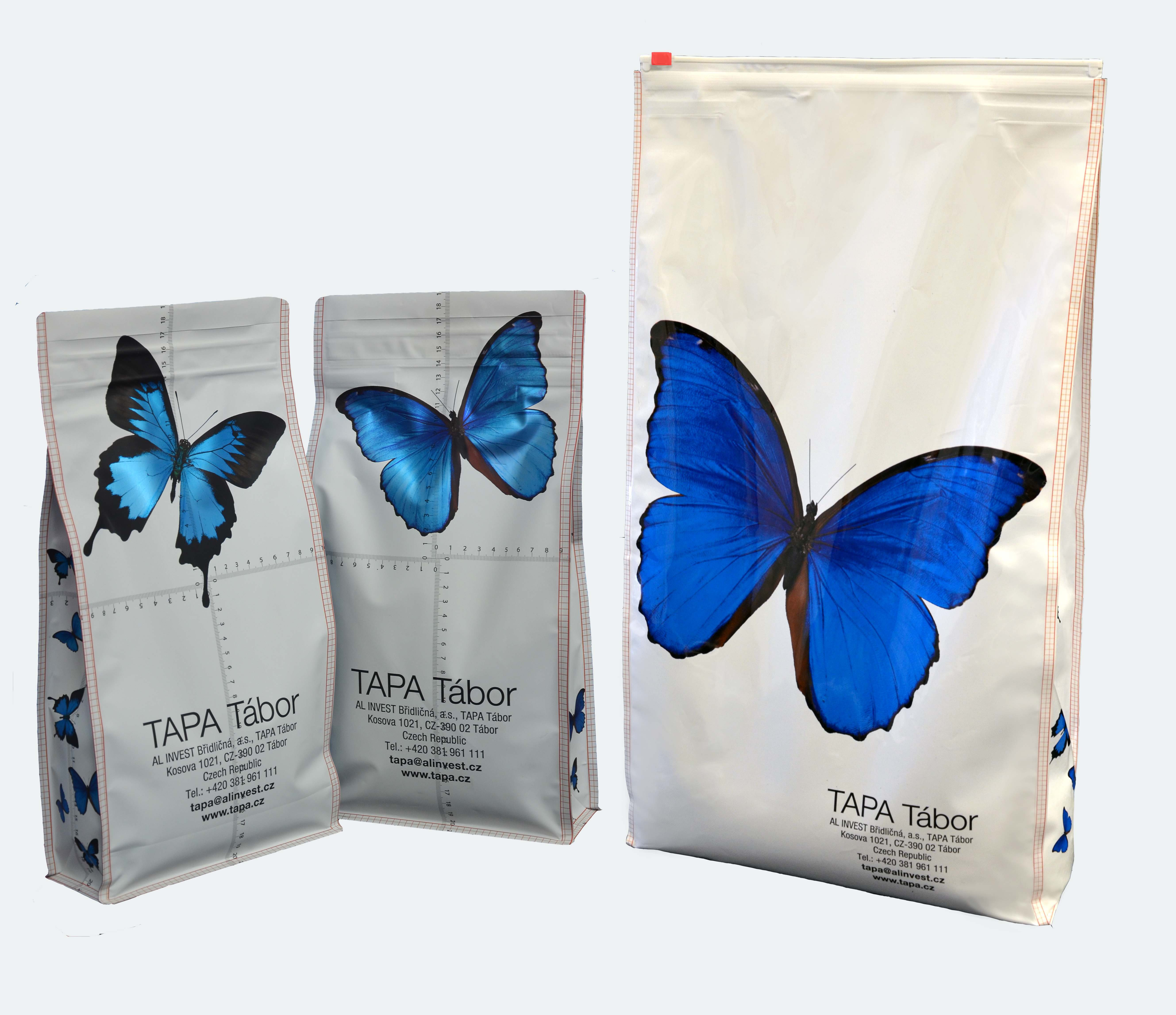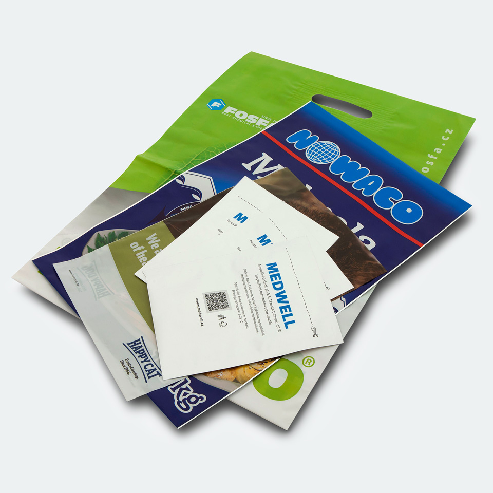- Různé kombinace materiálů BOPP, PET a PE (transparentní, metalizované, bílé)